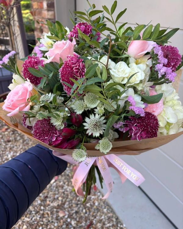 Eco-friendly wrapping and seasonal cottage garden inspired bouquet.